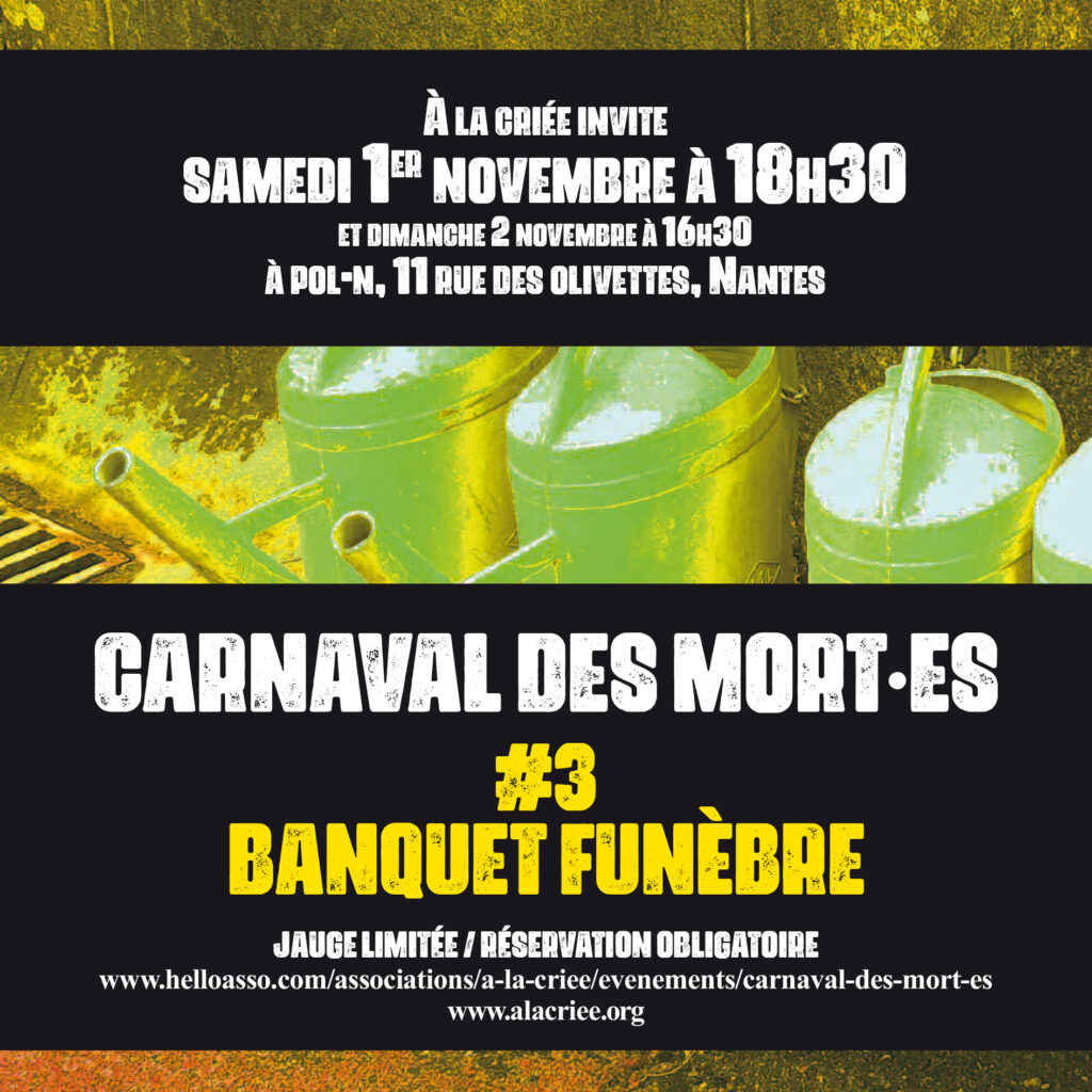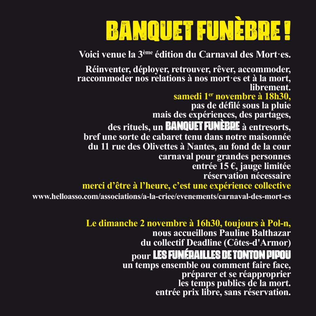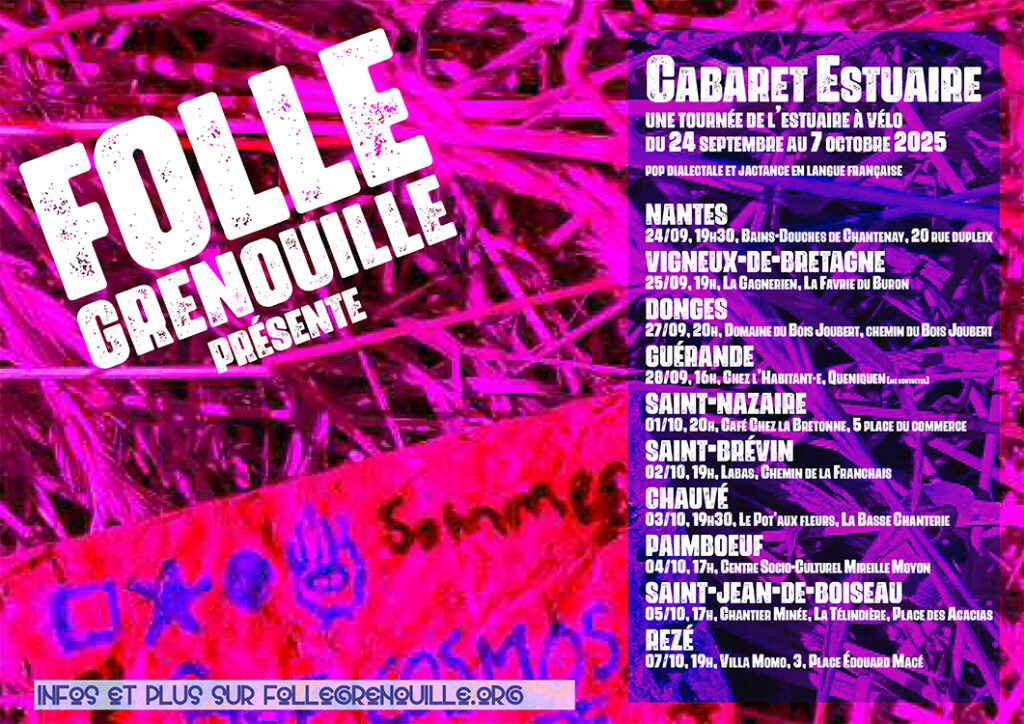 Nantes / mercredi 24/09 Bains-Douches de Chantenay, 20 rue Dupleix / 19h30 Vigneux-de-Bretagne / jeudi 25/09 La Gagnerien, La Favrie du Buron, impasse de la Gagnerie / 19h Donges / samedi 27/09 Bois Joubert, 2 chemin du Bois Joubert / 20h Guérande / dimanche 28/09 chez l’habitant·e, Queniquen [nous contacter] / 16h Saint-Nazaire / mercredi 01/10 Café Chez la Bretonne, 5 place du Commerce / 20h Saint-Brévin / jeudi 02/10 Labas, Chemin de la Franchais / 19h Chauvé / vendredi 03/10 Jardin Le Pot’aux fleurs, La Basse Chanterie / 19h30 Paimboeuf / samedi 04/10 Centre Socio-Culturel Mireille Moyon, 33 bd Dumesnildot / horaire en cours Saint-Jean-de-Boiseau / dimanche 05/10 Chantier Minée, La Télindière, Place des Acacias / 17h Rezé / mardi 07/10 Villa Momo, 3 place Macé / 19h